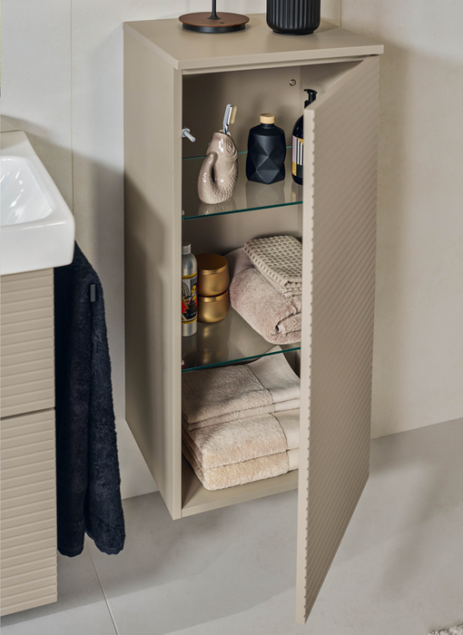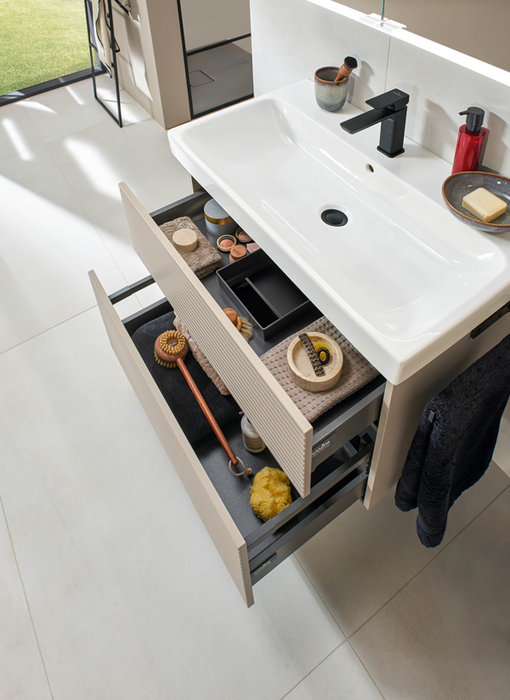 Die Architectura-Keramik wird ergänzt durch eine neue, eigene Möbelkollektion, die Unterschränke in allen Waschtischbreiten vom 100er Schrankwaschtisch bis zum 36er Handwaschbecken sowie zwei passende Hochschränke umfasst. Je nach Modell und Breite sind die Unterschränke mit Auszügen oder Türen bzw. mit Türen und einem offenen Fach ausgestattet. Auszüge und Türen, die alle mit SoftClosing-Funktion versehen sind, werden mit einer aufgesetzten Griffleiste geöffnet und geschlossen. Die Möbel sind in fünf aktuellen Oberflächen erhältlich: Neben den warmen Holztönen Nordic Oak und Kansas Oak gibt es die zeitlosen Unifarben Farben Glossy White, Glossy Grey und White Matt, die via Express Delivery kurzfristig lieferbar sind.